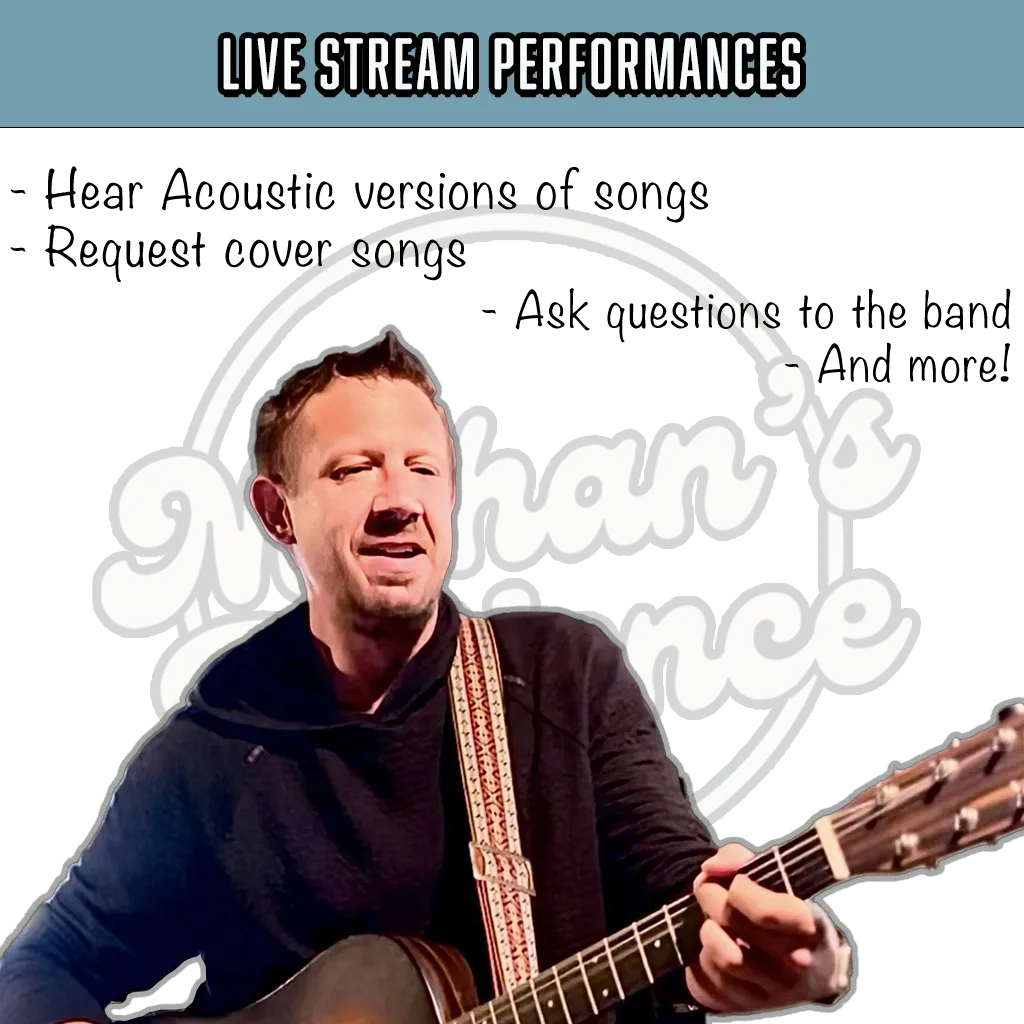 Access to weekly or monthly private VIP ONLY live streams with the band/Nathan for live acoustic performances, Q&A, jokes, laughing, chaos and more.